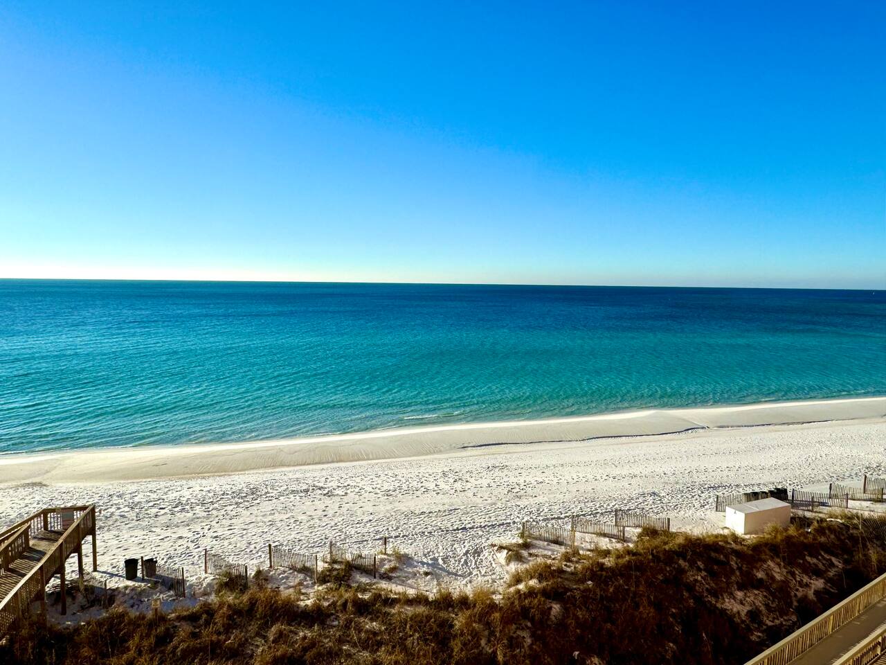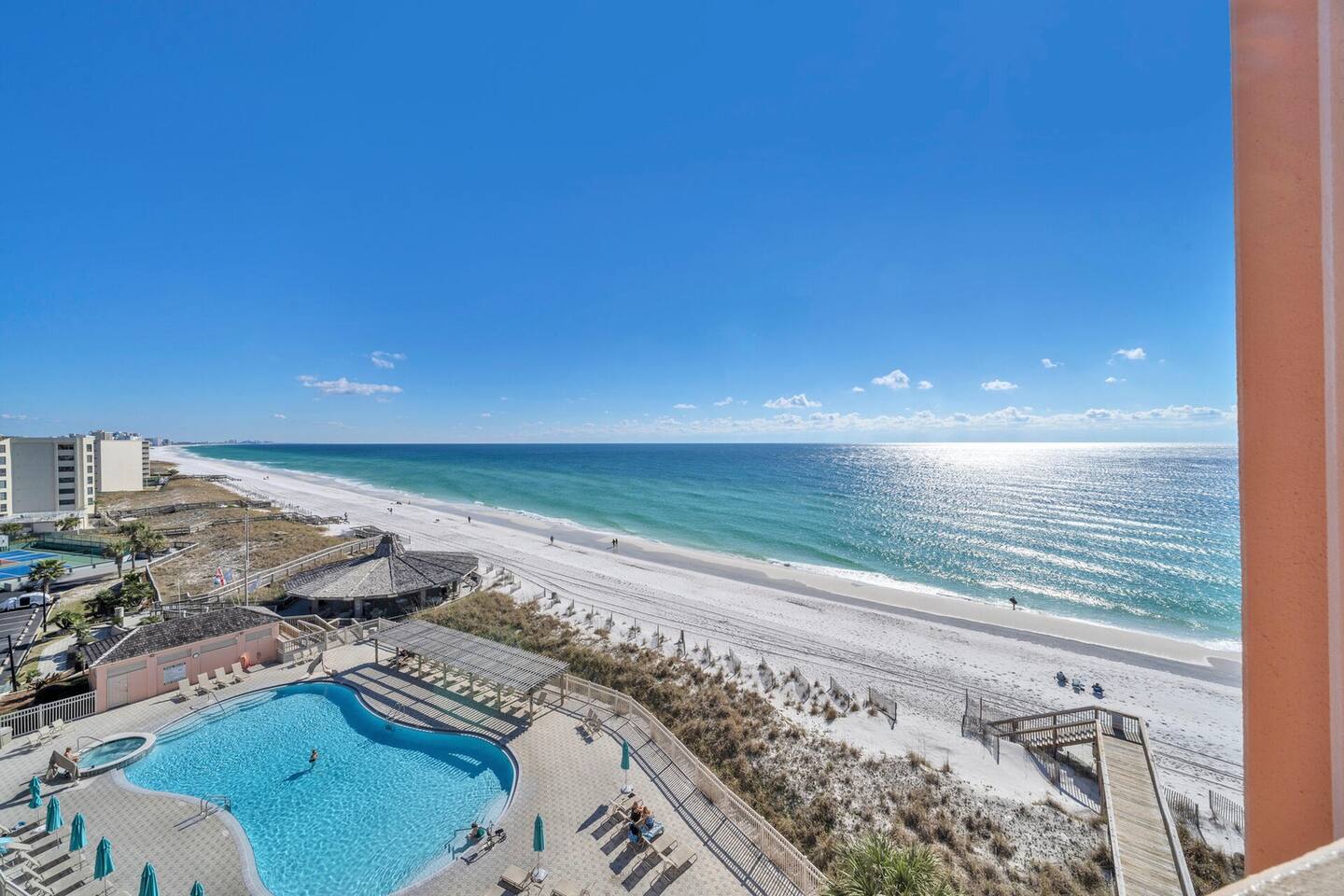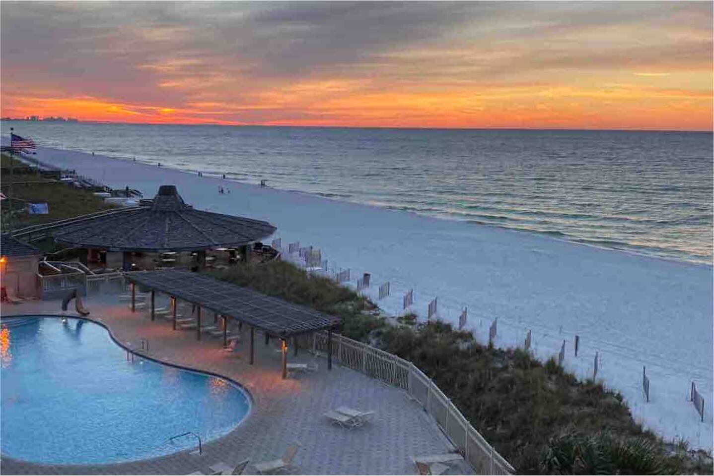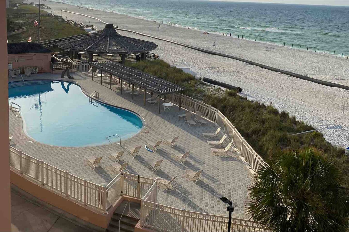 â‘Master Bedroom:①✔ Spacious room with a king-sized bed for restful nights by the sea ✔ Elegant designer nightstands and a calming ambiance ✔ Closet and dresser for ample storage space ✔ Extra pillows and blankets for added comfort â‘Living Room:①✔ Cozy seating area perfect for unwinding after a day at the beach ✔ Full-size sleeper sofa with a memory foam mattress for additional sleeping space ✔ 50-inch HDTV loaded with streaming services (Amazon Prime Video, Netflix, Hulu, Disney+, Apple TV, standard cable, and DVD player) for endless entertainment â‘Kitchen and Dining Area:①✔ Fully equipped kitchen with stainless steel appliances: refrigerator, stove, oven, microwave, and dishwasher ✔ Cooking essentials provided, including pots, pans, oil, salt, and pepper ✔ Keurig coffee maker, hot water kettle, toaster, and blender for convenient meal prep ✔ Dining table and bar seating—perfect for meals or remote work â‘Bathroom:①✔ Stocked with plush towels, makeup washcloths, shampoo, conditioner, body soap, and shower gel ✔ Hot water for a relaxing shower after sun-filled beach days â‘Outdoor Space:①✔ Private balcony with comfortable furniture to enjoy breathtaking ocean, beach, and pool views ✔ Nearby beach access for your convenience ✔ BBQ grill and outdoor dining area for al fresco meals ✔ Sun loungers to soak up the Florida sunshine â‘Additional Amenities:①✔ Heated pool (91°F in winter) and year-round hot tub for relaxation ✔ 2 beach chairs, an umbrella, beach towels, and sand toys for your beach day ✔ Washer and dryer in-unit for hassle-free laundry â‘Safety and Security:①✔ Smoke alarm and fire extinguisher for peace of mind ✔ Private entrance and self-check-in with keypad for hassle-free access ✔ 24-hour gated resort with security staff â‘Entertainment and Connectivity:①✔ High-speed WiFi throughout the condo ✔ Streaming services and DVD player for family movie nights â‘Heating and Cooling:①✔ Central air conditioning and heating for year-round comfort â‘Parking and Facilities:①✔ Free parking on the premises ✔ Elevator access for easy transport of luggage and groceries â‘Services:①✔ Pickleball, tennis, and shuffleboard equipment available at the front gate Your stay at Sea-La-Vie promises tranquil comfort, unmatched convenience, and an incredible beachside escape. Enjoy live music and family-friendly activities in the summer! Book now to secure your dates and make your dream Gulf Coast adventure a reality!