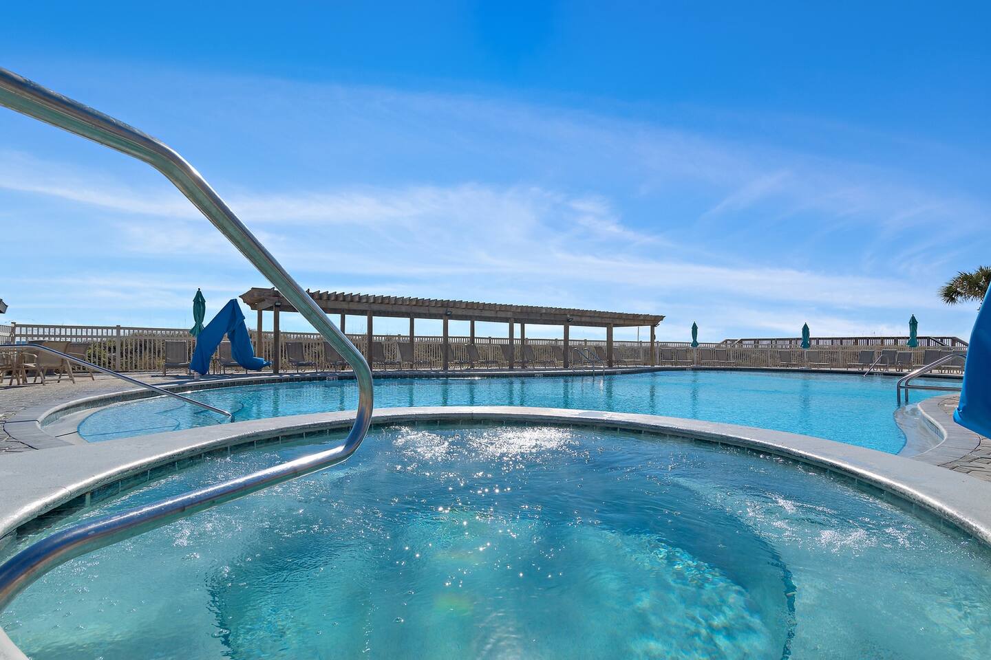 This is a GATED COMMUNITY. You will receive a parking pass at the front gate upon arrival. (24 hour gate keeper) This is also a resort with many activities for children, as well as, adults. There is Live music at the pavilion a few nights during the week(seasonal). Also, tennis courts, pickle ball, and basketball courts are available for your use. The pavilion with charcoal grills and tables is open to all guests. There are beach chairs and an umbrella, as well as, beach toys for your use. The pool is heated during the winter months. There is also a poolside hot tub open year round. A beach setup (2 chairs & an umbrella) can be purchased for $52/day.